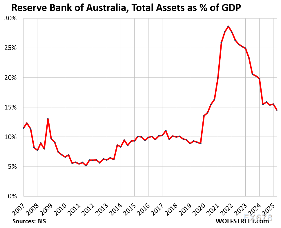 加拿大央行在实施短期但规模空前的QE后,于2020年第四季度触及24.7%的资产/GDP峰值。